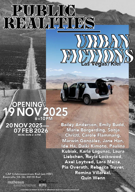 Wie formen Stadt, Landschaft und Imagination unsere Vorstellung von Wirklichkeit? Die Ausstellung Public Realities – Urban Fictions verwandelt eine stillgelegte Spielhalle im CAP Erlebniscenter Kiel in einen temporären Ausstellungsraum. Künstler*innen aus Kiel und Las Vegas reagieren in unterschiedlichen künstlerischen Medien auf den Ort – zwischen Konsum und Leere, Realität und Fiktion. Ausgangspunkt ist eine Forschungsreise nach Las Vegas, bei der Studierende der Muthesius Kunsthochschule urbane Phänomene wie Spektakel, Simulation und die Beziehung zwischen Mensch und Umwelt untersuchten. Aus den Erfahrungen während der Reise entwickelten sich erste Skizzen und spontane Interventionen Vorort. Zurück in Kiel wurden die Ansätze und Eindrücke weiterentwickelt.